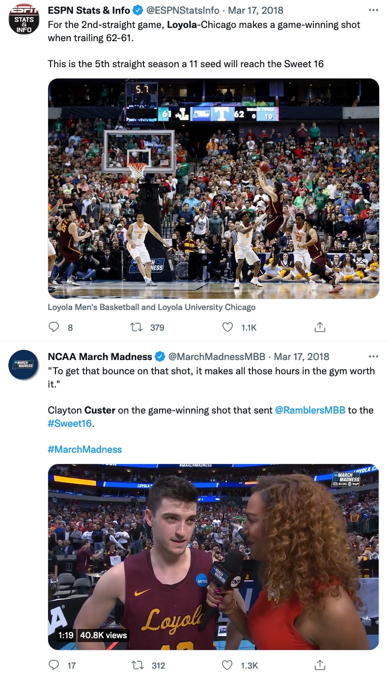 What could have gone wrong: Almost any other bounce on Custer's jumper could have ended the Ramblers' season. Similar to how Loyola Chicago got a friendly bounce, or five, on Lonnie Walker IV's free throw attempt in the first round, the Ramblers benefited from a shooter's touch to knock off Tennessee. Custer's shot was far from a great look – it was an off-balance jumper against solid defense and he was never truly squared towards the basket.