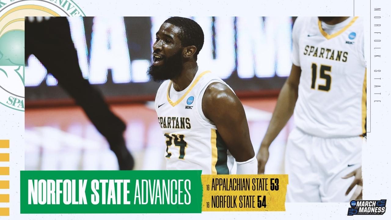 With 8.6 seconds to play, Norfolk State's Devante Carter got fouled and made two free throws to give the Spartans a one-point advantage. On Appalachian State's final possession, it missed two shots โ€” the Mountaineers missed their final 10 attempts โ€” giving Norfolk State the 54-53 win.