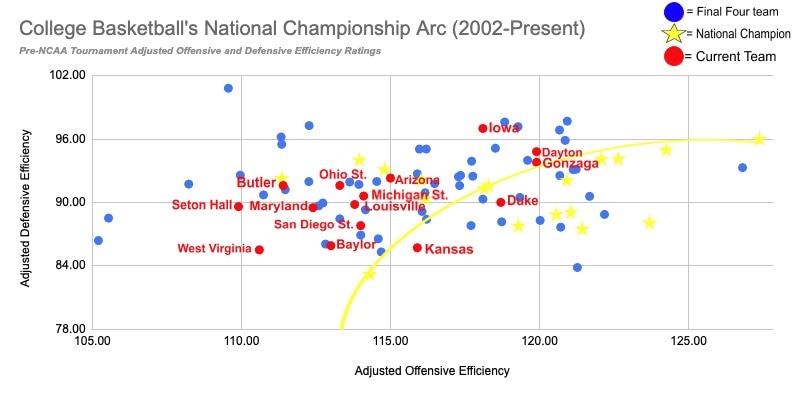 So while it's not a hard-and-fast-rule that a school's pre-NCAA tournament efficiency ratings must fall inside the arc to win a national championship, you'll find that most recent national champions fit this similar profile, which we can then use to project forward for this season.