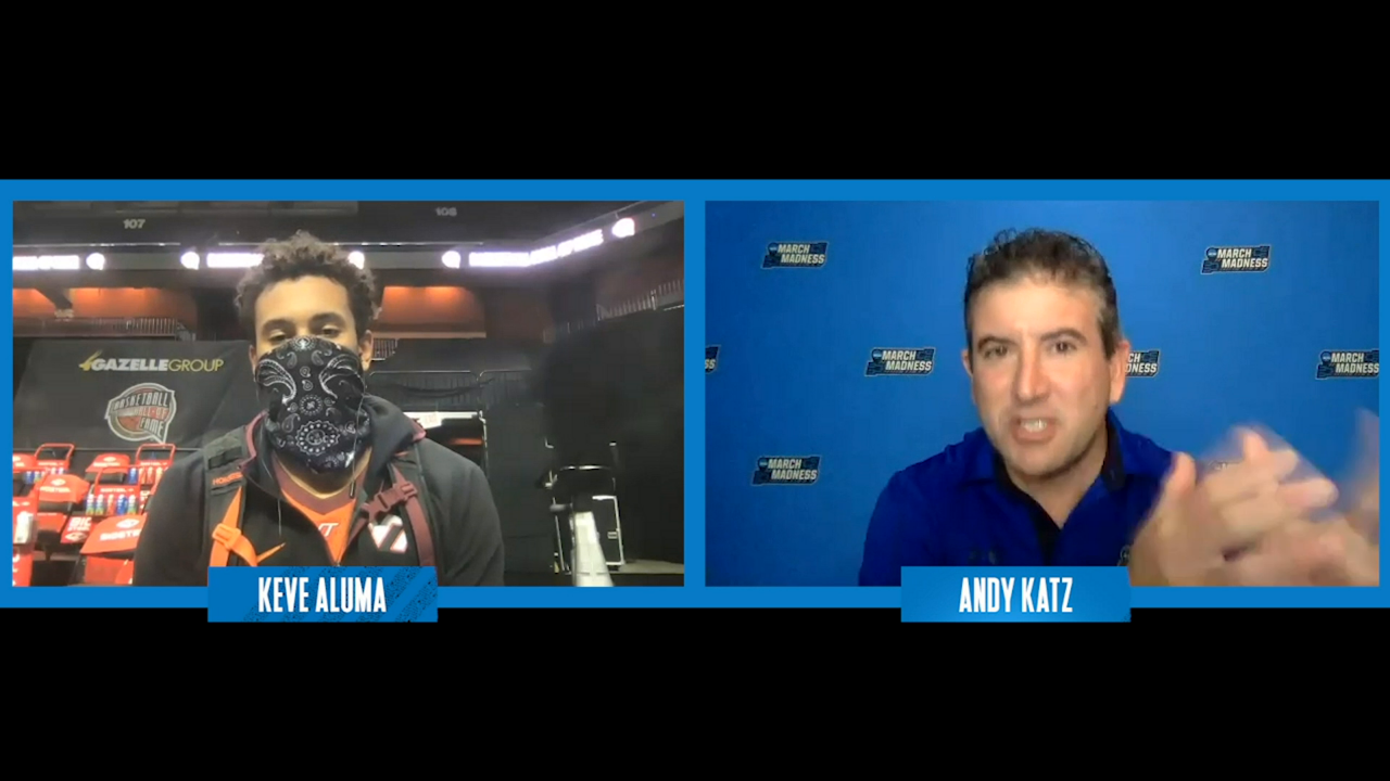 Virginia Tech's Keve Aluma talks with Andy Katz after the Hokies' upset win over No. 3 Villanova