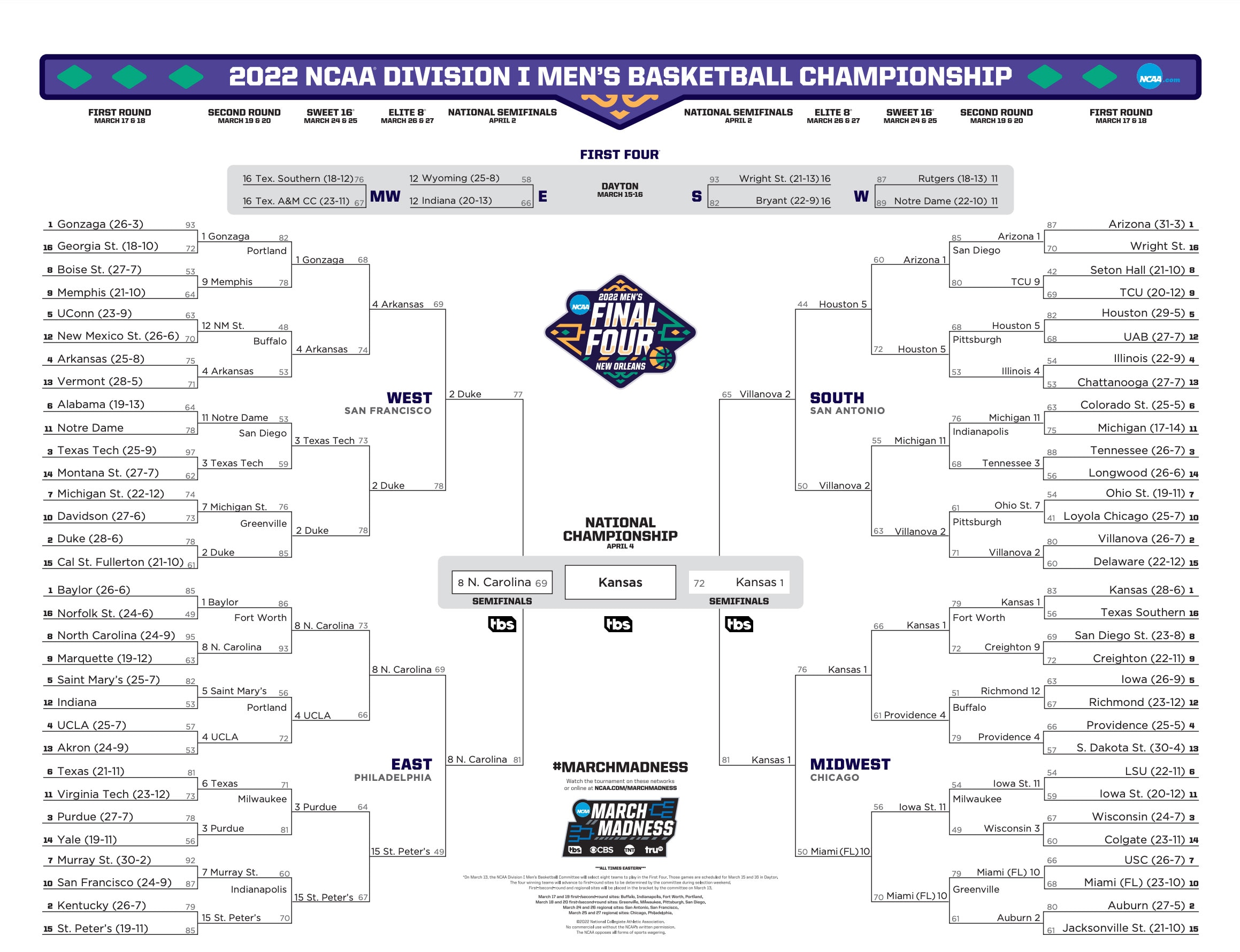 2022 NCAA bracket: Scores, stats, records for March Madness men’s tournament