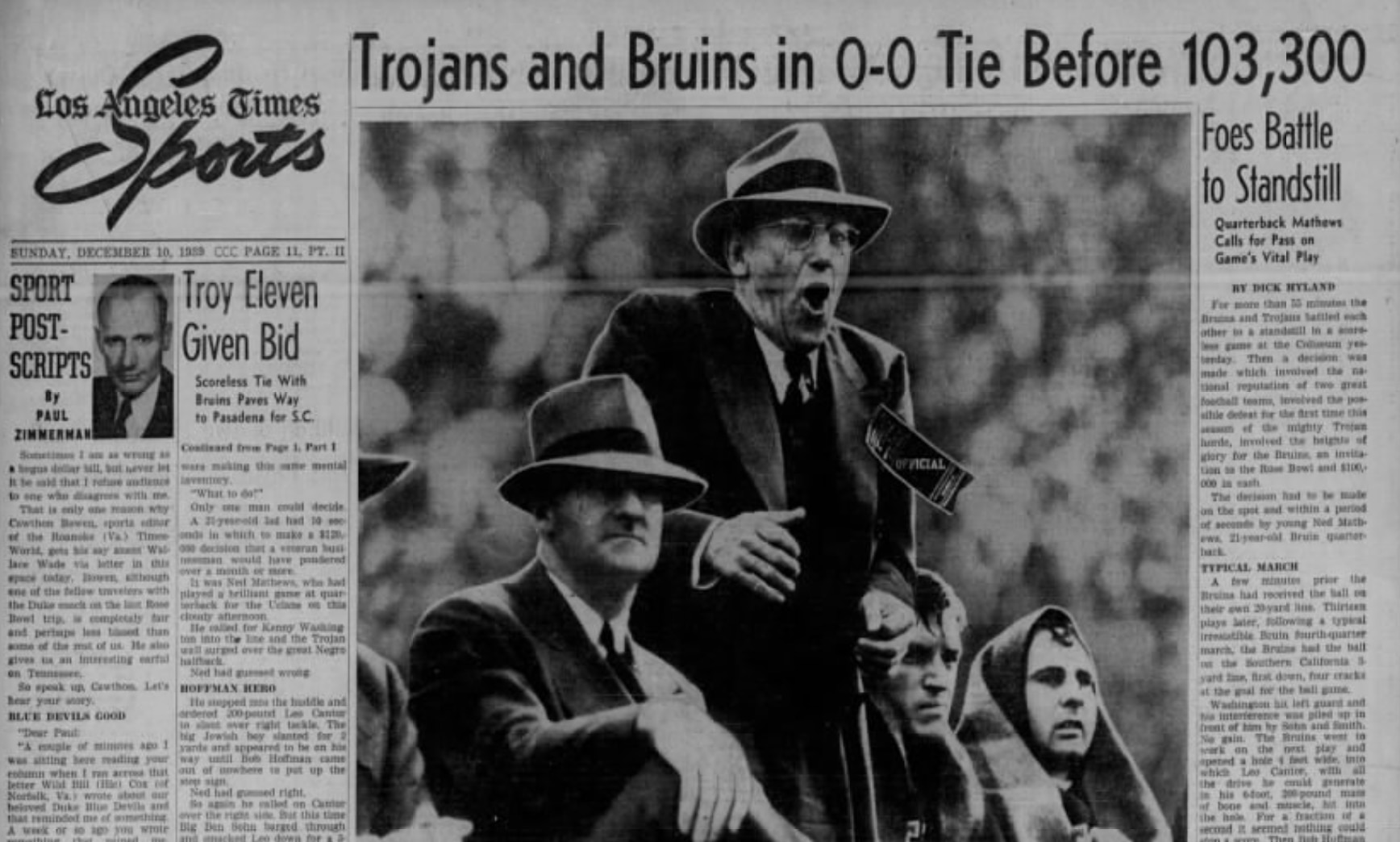 UCLA's 1939 season culminated with a clash with crosstown rival Southern California. The Trojans were ranked No. 3 in the country, the Bruins No. 9. Neither team had lost all season and Southern California was just two weeks removed from a road win over No. 7 Notre Dame. A bid to the Rose Bowl was on the line. A crowd of 103,300 gathered for the occasion.