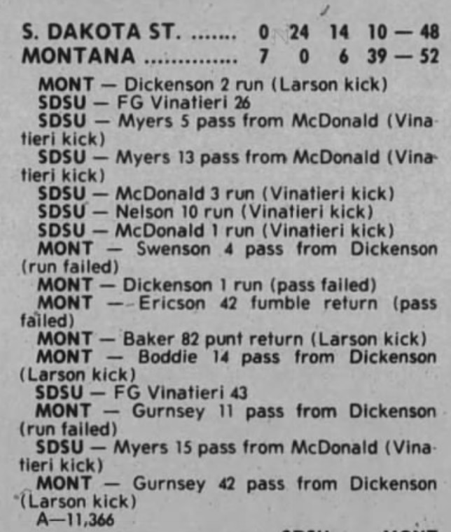 Montana's 39 fourth-quarter points are the most ever scored in a comeback win. The historic rally was punctuated by sophomore Dave Dickenson's go-ahead 42-yard touchdown pass to Scott Gurnsey with 21 seconds left in the game on a fourth-and-one play. Dickenson finished with four touchdowns and 401 passing yards in his first-ever collegiate start.