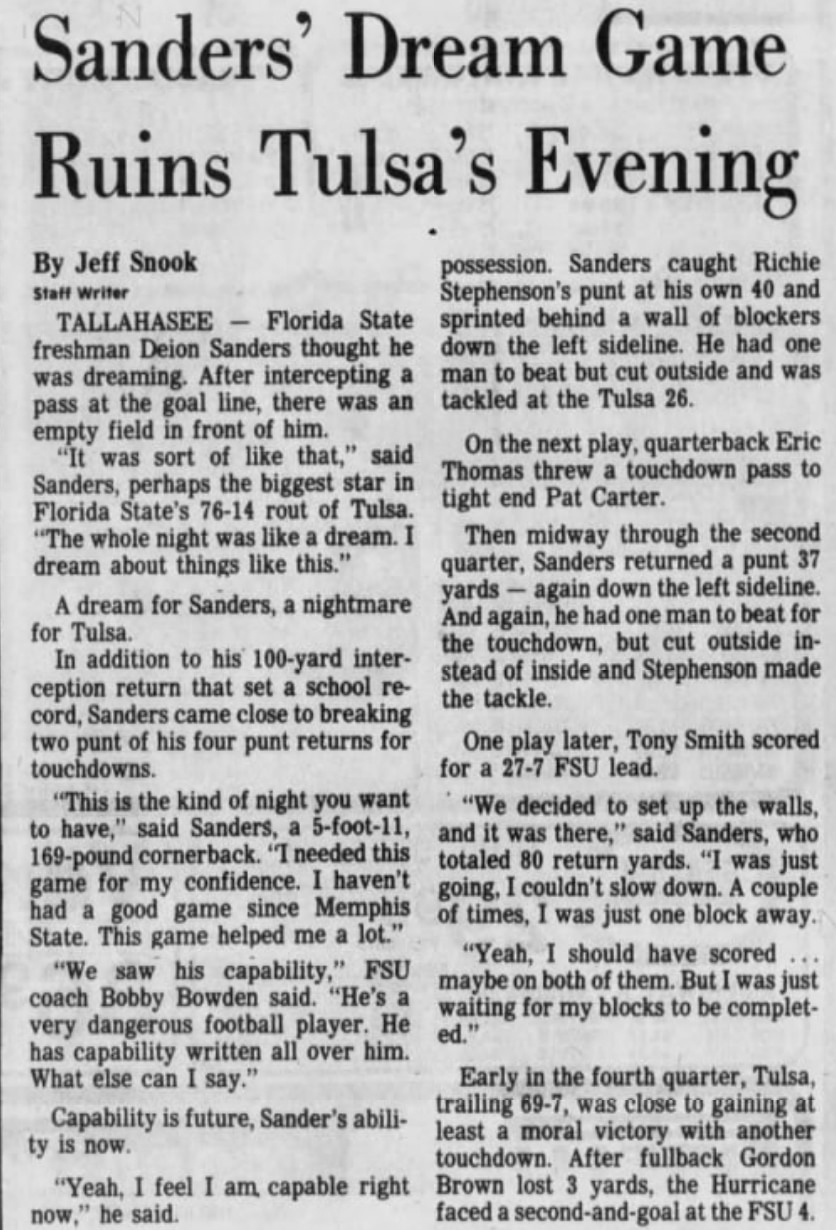 "If the visitors, 3-3, coming in after three straight victories, were not intimidated by FSU's defensive work in an opening series, it surely merits applause," reported the Tallahassee Democrat. "On the first play, Deion Sanders missed in an interception that he might have run back for a touchdown when a teammate went for the ball in front of him, perhaps blunting his vision or concentration ... Soon, Deion Sanders raced 30 yards with an interception, highlighting a fine day for the All-America cornerback. On five punt returns, Sanders collected 72 yards.