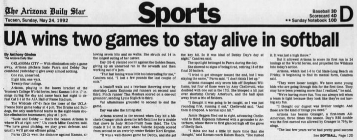 Against Kansas, Arizona's Susie Parra pitched a complete game shutout, allowing seven hits and striking out 14 while retiring 18 of the final 20 batters. Four of Arizona's seven hits came from Amy Chellevold. Her pivotal double with one out in the 17th set up the Wildcats for an extended postseason. She advanced to third on a flyout and came home on a throwing error to first. The final game time was 3:18. Arizona eventually fought back into the winner's bracket and fell to UCLA in the finals.