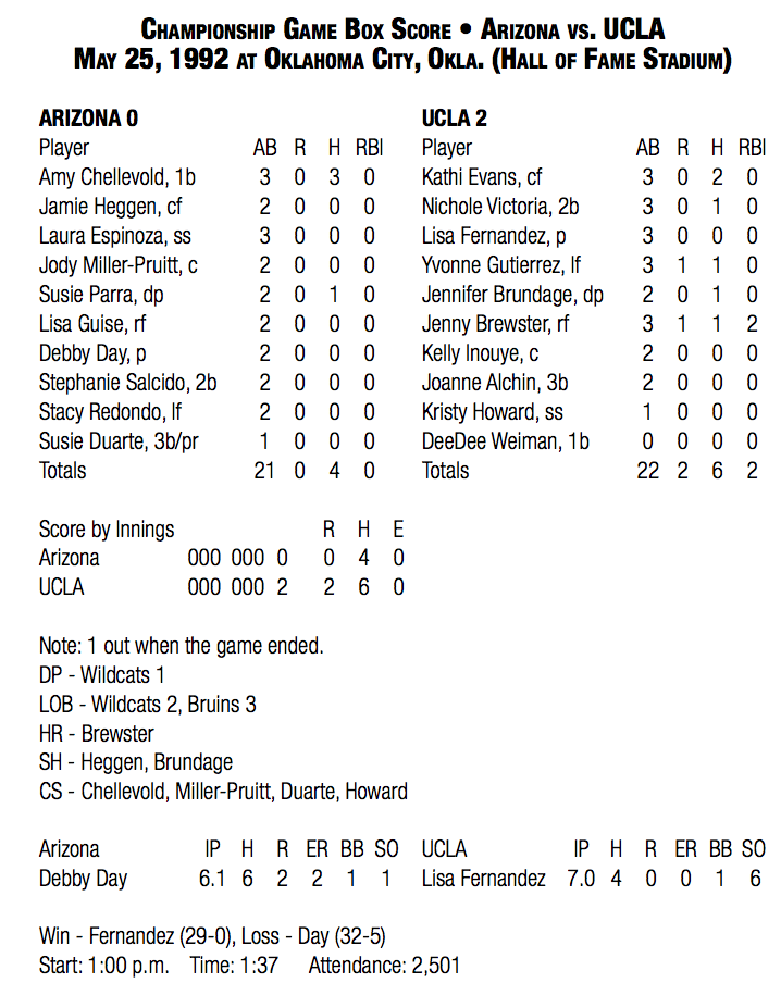 Fast forward to 1992. Fernandez is the ace for the Bruins in the midst of a perfect junior season. The softball is still white. Yes, white. The Bruins are facing Arizona, and Debby Day was in the circle for the Wildcats. Fernandez described Day as a competitor, just like she was.