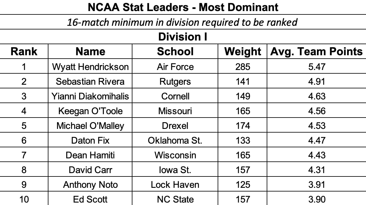 In Division I, Air Force heavyweight Wyatt Hendrickson continues to hold a dominant lead for Most Dominant Wrestler with an average of 5.47 team points per match behind his 19-0 D-I record with 13 falls, tied for the most in the division. The national leader in tech falls, Sebastian Rivera of Rutgers, is second with a 4.91 average, while two-time national champion Yianni Diakomihalis of Cornell is third with a 4.63 average.