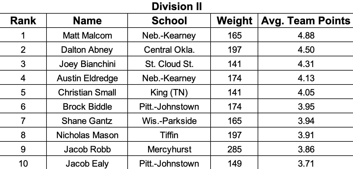 A national champion in 2019, Matt Malcom of Nebraska-Kearney leads the Most Dominant standings in Division II with 4.88 team points per match, which is a significant lead over second place Dalton Abney of Central Oklahoma at 4.50, while St. Cloud State 141-pounder Joey Bianchini is third at 4.31.